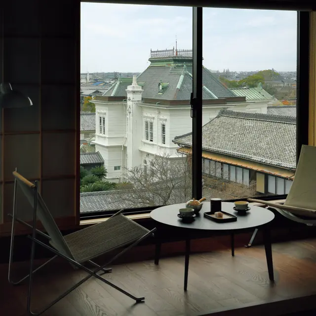 8タイプある客室は、庭園と建物を見渡す文化財ビューの客室が人気。備品には、歴史を踏まえて深川製磁の茶器を取り入れる一方、バスアメニティには100%自然由来のNEMOHAMOを採用したりと、伝統と未来とのバランス感が心地よい。