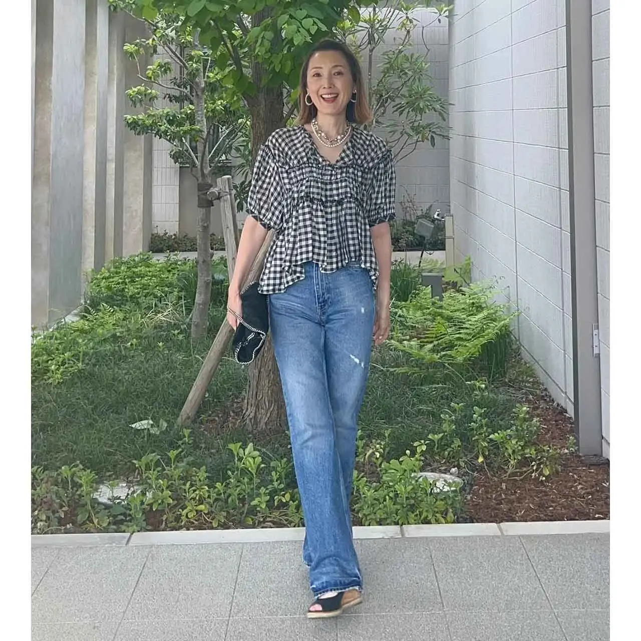 華組・倉爪佐和さん ブログ「流行りのギンガムチェックをデニムで大人の着こなし 開運コーデ14」より