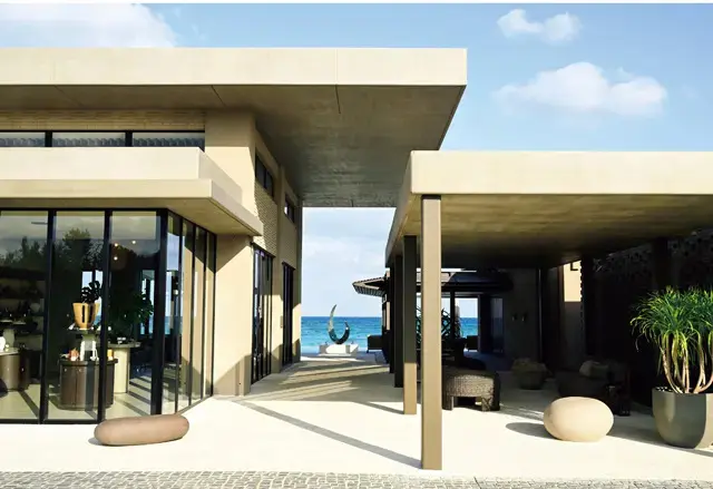 客室タイプにはヴィラと、より贅沢なハウスがあり、55室のすべてがオーシャンビュー、かつプライベートプールつき。室内は上品なベージュを基調にしたやわらかなカラーリングで、部屋にいても、島の自然とつながるような落ち着きが感じられる。家具やインテリアから建築まで、デザインを手がけたのは、オランダを拠点に世界で活躍する建築家ピート・ブーン氏。天然素材に直線を組み合わせた構築的なフォルムは、日本らしさをも思わせる。