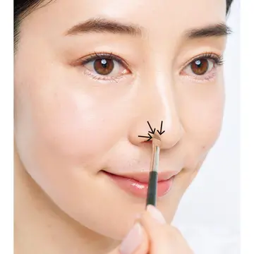 「人さし指をカギ形にし、第一関節と第二関節の間の平らな部分で鼻の軟骨部分を両サイドからはさみ、圧を与えながら下方向に軽く引っぱる。数カ所×10秒行うと、鼻の形がすっきり」