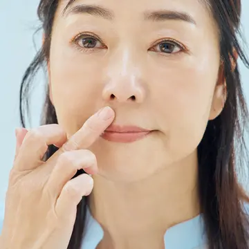 フェイスラインのベタつきや過剰な油分はトラブルのもとなので、メイク前に軽くティッシュオフ。