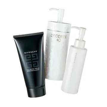(左)うっとりするような心地よいジェルの感触。ソワン ノワール メイクアップ リムーバー EX 175㎖ ¥10,000/パルファム ジバンシイ[LVMHフレグランスブランズ]