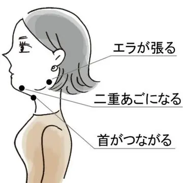 「姿勢の悪さ、ゆがみ、むくみによるもの。なかでも姿勢がカギ。皆さんは、丸まった姿勢や巻き肩になっていませんか? 背中が丸まって顔が前に出るとゆがみやすくなったり、首肩がガチガチに凝ることであごも固まりやすく。あごまわりに老廃物がたまって、もたつきやすくなるんです」。エクラ世代は支える力が弱ってくるため、姿勢が悪い人がほとんど。さらに昨今は、マスク生活による筋力低下も追い打ちをかけているそう。