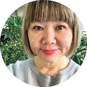 「ここ数年、白髪が目立つようになり、根元リタッチをするのが時間的にもメンタル的にもストレスに。そこで思いきってブリーチでハイライトを入れて、白髪をぼかしながら立体感を出すようにチェンジ。本当にノンストレスになりました。髪色が明るいから、好きな黒い服や小物も映えるようになっておしゃれもよりポジティブになったし、もっと白髪の量が増えたら透明感のあるカラーにしてみようかな、と将来の“変化”もむしろ楽しみに」