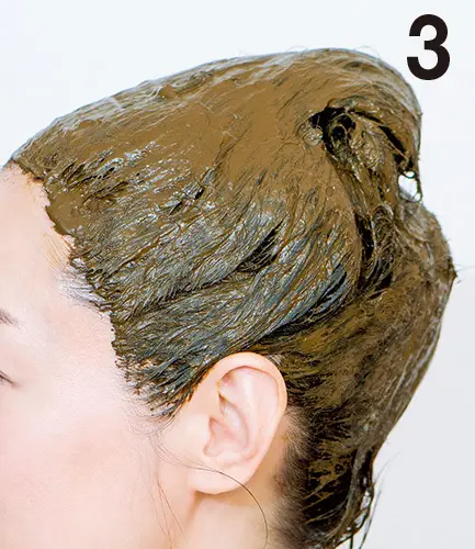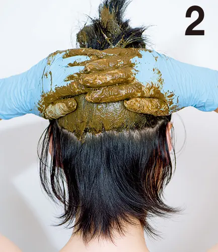 「長女を出産した36歳ごろ、白髪のためにヘナを始め、もう10年近くヘナで髪を染めています」という、ビューティモデルの熊田マリエスターさん。自身でヘナの量を調整し、ほのかな赤みのある色にカラー中だ。この10年で、ヘナ選びから染め方まで試行錯誤を経て方法を体得。まるで「プロのヘナ師」!