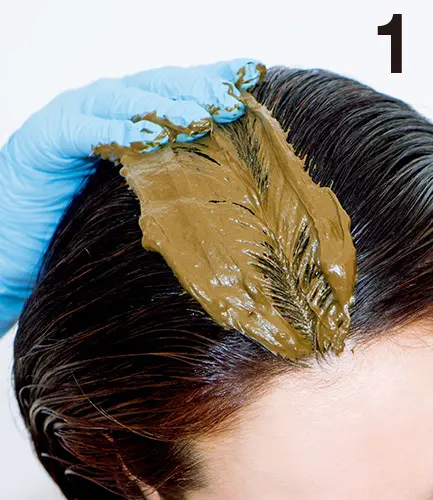 これが地髪のような自然さとツヤが美しい、ヘナとインディゴを組み合わせたカラーだ。「敏感なかたでもトラブルがほぼないというだけでなく、濃い色でしっかり染まること、ハリツヤが出て、髪質がよくなることなど、メリットもたくさん。一番人気はこげ茶のカラーで、色は明るくなりませんが、ニュアンスは選べます」(杉本さん)