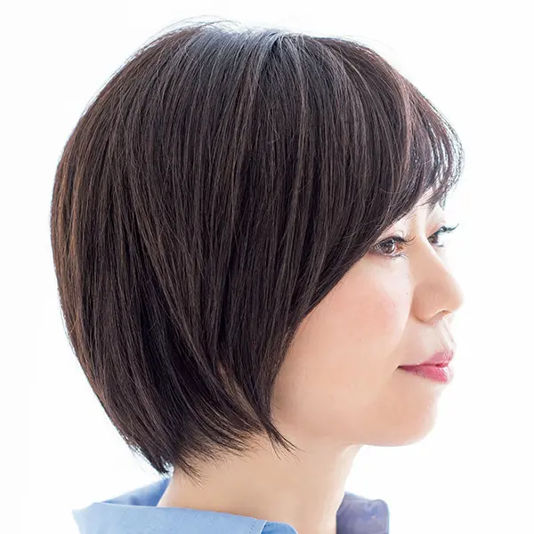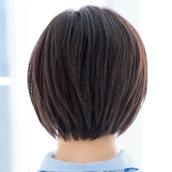 毛先を先細りするようにカットするのがコツ。全体的にまとまりよく見える、小顔効果抜群のボブスタイル。