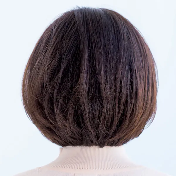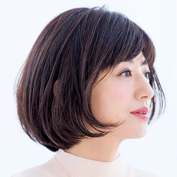 くせ・うねりが強く、毛量も多い髪質は、重めボブでまとまりよく。小顔効果のある「ひし形」に近づけながら、重さでやわらかさを演出。
