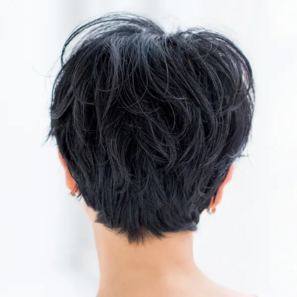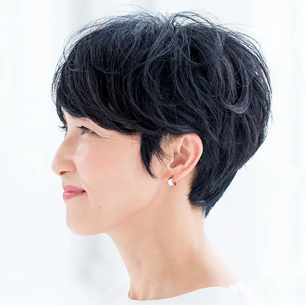 「短めショートは老けそう」という懸念は、マッシュベースで解決。襟足ともみあげをキュッとタイトに締めたメリハリショートで洗練された美人印象に。