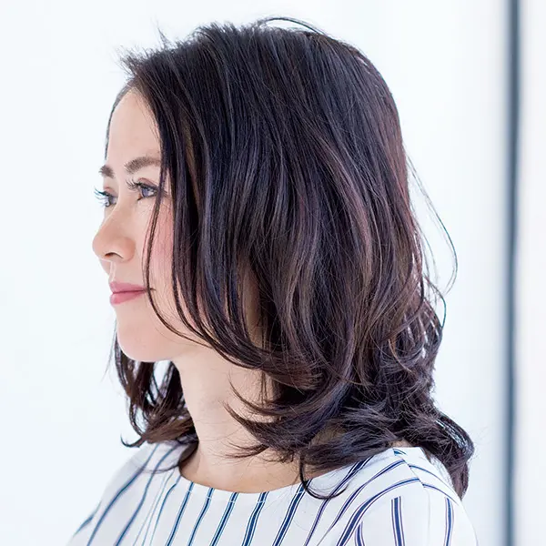 重めミディアムのベースに動きが出るようレイヤーを仕込み、明るいパーマとハイライトカラーで仕上げた自然な立体ヘア。
