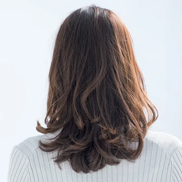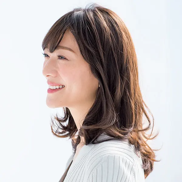 サイドの丸みと毛先のくびれ効果でボリュームゾーンをアップ。気になるたるみをカムフラージュするミディアムヘア。