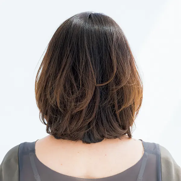 顔まわりのうねりが強くなってきたと感じたら、顔まわりとハチ上の髪にレイヤーをインして後ろへ流れる毛流れをつくったボブヘアでカムフラージュを! パーマをかけ、丸みのあるフォルムに仕上げたらいっそう目立ちにくいヘアスタイルに。