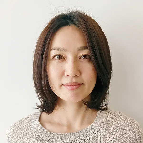 寝ぐせ風に見えがちな硬い髪質のはねたうねり毛は、全体にレイヤーと毛量調整をかけた“曲線フォルム”に仕上げて解消。髪の中間を根元から間引き、空間をつくることで軽さも演出。