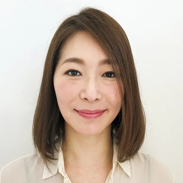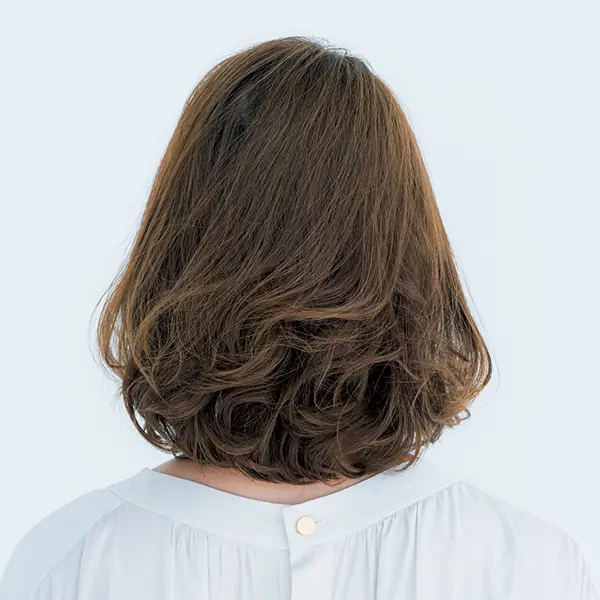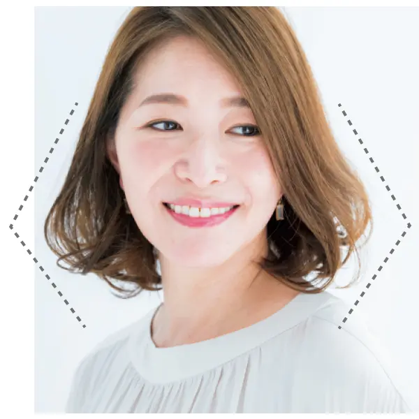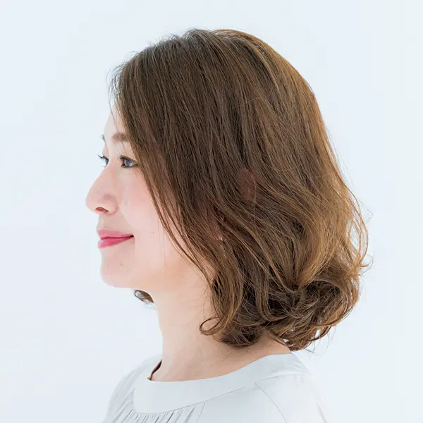 毛先に厚みを残したシルエットに仕上げることで横幅を出し、ボリュームのなさを解消できる! 鼻先の位置にひし形の角をつくることで小顔効果が叶います。