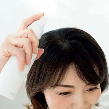 いつもの分け目に直接ではなく、分け目から左右それぞれ2㎝ほど離れた地肌へ、ドライシャンプーを直接スプレーする。