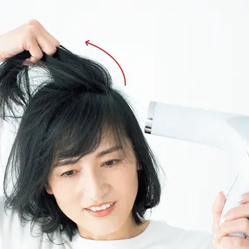 「これがとっても大事なひと手間! もっとボリュームが欲しいところを、カーラーで撫でるようにブラッシングします。カーラーの余熱で、ふんわり感がアップするんですよ」。