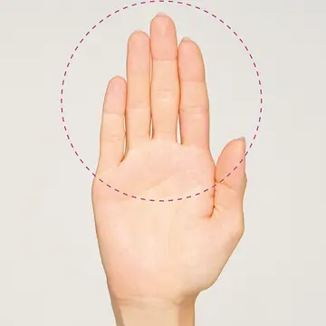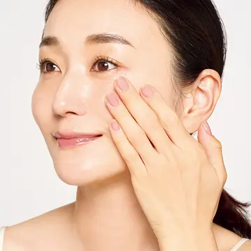 手の甲からファンデーションをとり、引き上げるように頰、額に塗り広げる。目もと、鼻まわり、口もとは指先でなじませて。