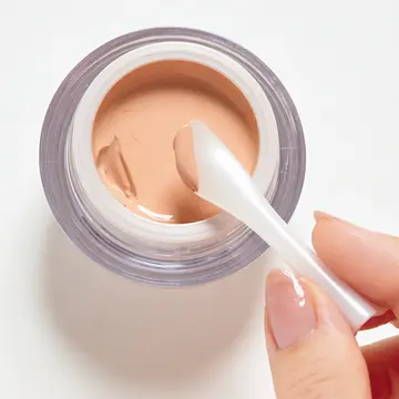 ぷるぷるのジェリーは、スパチュラで崩しても、時間がたつと自然となめらかに。肌に塗り広げたときも凹おう凸とつや色ムラを包み込んで、表面がフラットで均一なフィルムを形成。