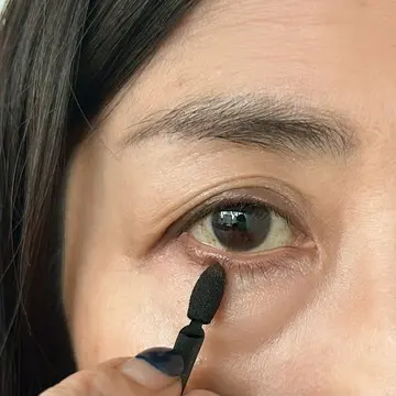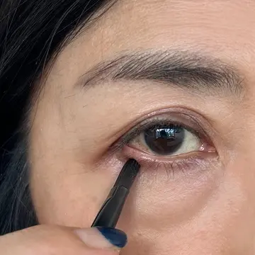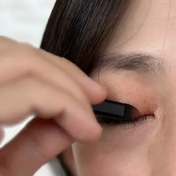 ③左下の赤みオレンジをチップの先にとり、上まぶたの目頭の際のみに入れる。目頭から黒目の内側までが目安。
