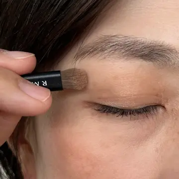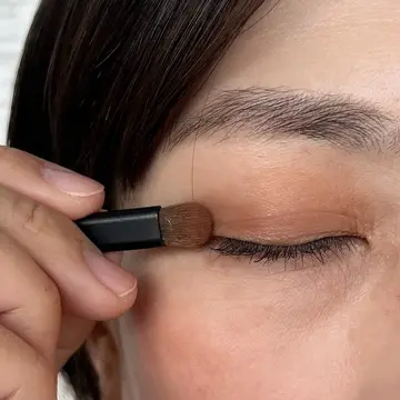 ②右上のマットなブラウンを、ブラシの幅で上まぶたの際全体に入れる。