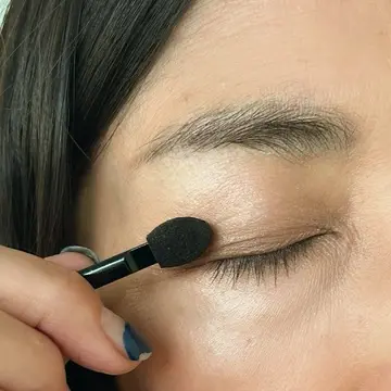 ③右下のラメブラウンをチップにとり、上まぶたの目じり側3分の1に重ねる。