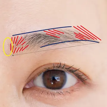 まずは眉マスカラで染めた眉をよく観察。全体を描くのではなく、まばらに見える部分だけを描き足す。