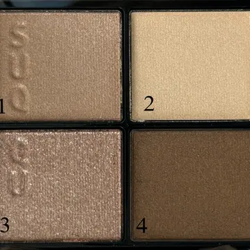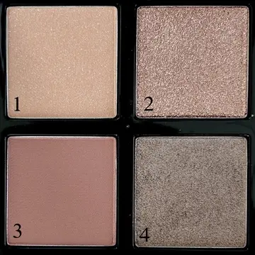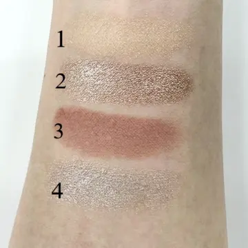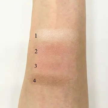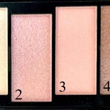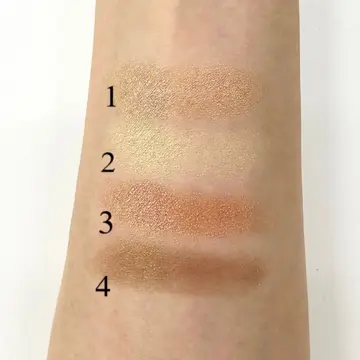 ①1を眉下まで広く広げ、2をアイホール全体にオン。パール感を控えめに仕上げたい場合は