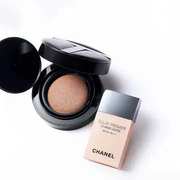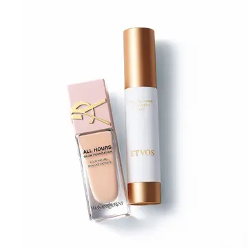 ツヤとマットが共存する今っぽいセミマット肌。パール配合のクラランスのベージュ下地でくすみや色ムラを飛ばし、頰など欲しいところにパンとしたハリを宿すエクシアのエマルジョンファンデーションで立体感をプラスして。(岡田知子さん)