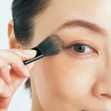 ふだん使いのリキッドファンデーションをごく少量手のひらに出し、極小ブラシの先端にとってよくなじませて。肌をかすめるくらいの軽いタッチで目の下の三角ゾーンに上から下に広げる。