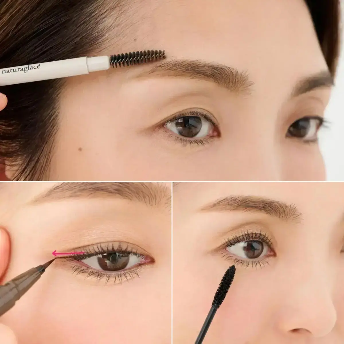 【2】左右の手の親指と人差し指で、眉をつまんでもみます。眉頭から眉尻まで、眉全体をまんべんなく。これを10秒くらい行います。