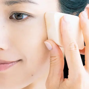 ピンク下地を塗る前に、まずはUV下地を顔全体になじませ、しっとりペトもちの状態に整える。ピンク下地にUV効果があっても顔全体に広げるのはNG。ピンクの膨張効果で、顔が大きく見える可能性大。