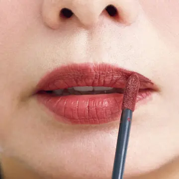 「ブラウン強めのレッドリップをしっかり塗ると、顔のシミが一気に目立たなくなるんです。逆に白っぽいピンクリップは、グレーっぽいシミが悪目立ちするので注意」。火照(ほて)ったような血色と鮮度の高いツヤが美しい。(1/1発売)¥4,100/イヴ・サンローラン・ボーテ