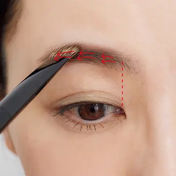 眉下のガイドラインを、❶のペンシルで黒目上から眉じりへ実際に眉の生えている部分より下めに描く。毛のない部分は❷のリキッドで1本ずつ描き足す。