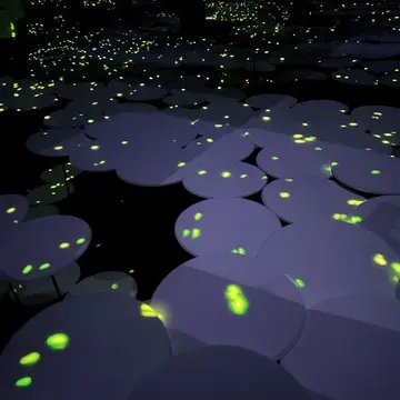 うってかわって、こんどは自然を感じるお部屋に。まるで「棚田」のように風にそよぐ、みずみずしい草が描かれています。時がたつと、それは蓮の花と葉に姿を変えていきます。そしてさらには、暗闇に光る、蛍が点々と……。お部屋に工夫があって、この「棚田」が立体的に感じられ、長くいたい空間でした。