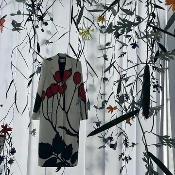 ロエベ初のファッションショーが開催されたのは、1965年だそうです。展示してあったのは、ロエベならではの、見るからに滑らかなナッパレザーのコート。ノットベルトが、洗練されたたたずまいに。
