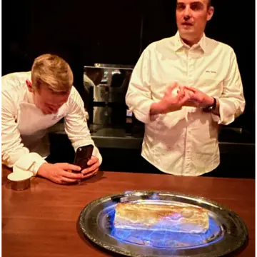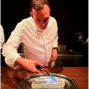 テーブルのすぐ横にはキッチンがあり、シェフが手早くお皿を仕上げていく様子がよく見えます。あれはもしや……?