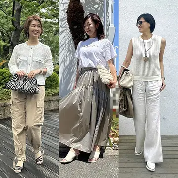 夏ファッションに欠かせない「Tシャツ」。さっと着られる便利なアイテムですが、シンプルゆえに着こなしが野暮ったくなってしまうことも。そこで今回はおしゃれなアラフィー読者モデル華組3人の「Tシャツ」を使ったコーディネートをご紹介。ぜひ夏の参考にしてみて!