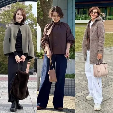 この日はブラックのワンツーコーデに、カーキのケープで。もこもこのバッグで季節感をプラスしてみました。