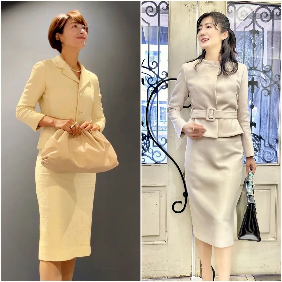 「想定した着用シーンは“かしこまりすぎないセレモニー”。アイボリーカラーのジャケットは春らしく、厳粛すぎない学校での入学式や、保護者同士の懇親会などにも取り入れやすいと思います。落ち着きと柔らかさを兼ね備えた、信頼感のあるコーディネートです。