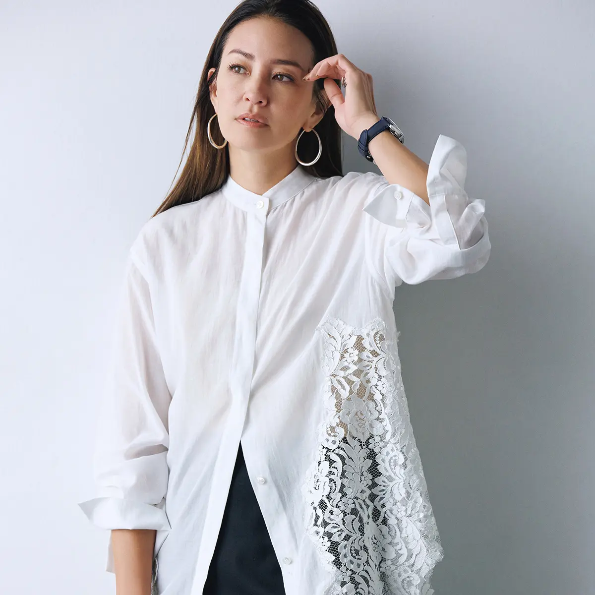 シルクツイルのパンツは控えめでありながら美しい光沢。その色は、純白ではなく、shiro nezuという、薄いグレーがかった色味。軽く羽織ったリネンジャケットの抜け感が、素材や質感の違いで奥行きを生み出してくれます。