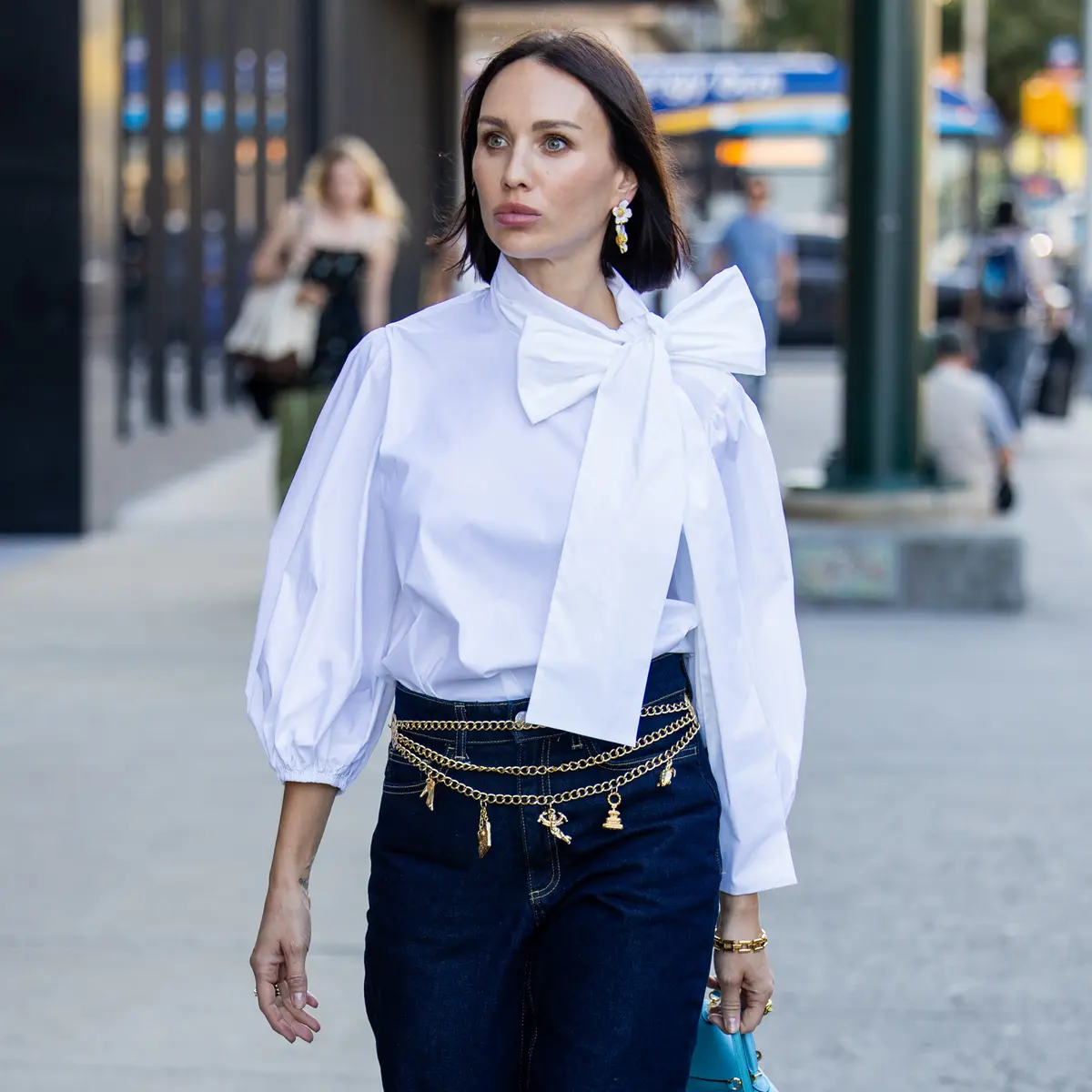 甘い白シャツとワイドデニムパンツを合わせて上品に