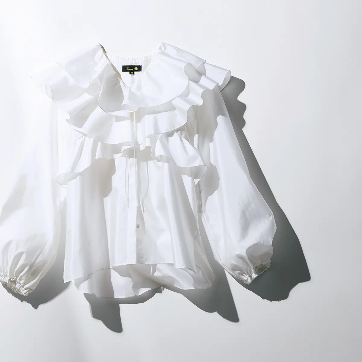 顔まわりが一気に華やかになり、一枚でコーディネートの主役になる存在感です。シンプルなパンツを合わせるだけでもぐっと印象的なスタイリングになります。お洋服の素材が、ポリエステル製で張りがあるのでリボンをふわっと膨らませても、そのままの形がキープされます。