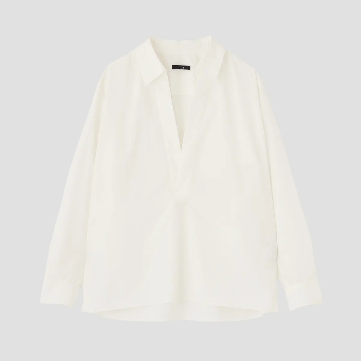 フロント部分の細かなプリーツ、すっきりしたバンドカラーで清潔感とフェミニンさを両立。ジャケットのインナーなどにもぴったりで、通年活躍するデザイン。