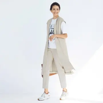 体になじむとろみ感のある素材のセットアップは、タウンユースにちょうどいい抜け感と品の良さがある。オールホワイトのクリーンな着こなしに、夏のムードを先取りする黒小物を添えてメリハリを出して。