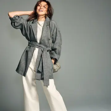 最高気温23℃で曇りの日は、ブラウスやシャツ1枚だと肌寒さを感じることも。そんなときにさっと羽織れるトレンチコートは、中に着るコーディネートで軽やかさを出すだけで、今の時期にあうすっきりした印象に。
