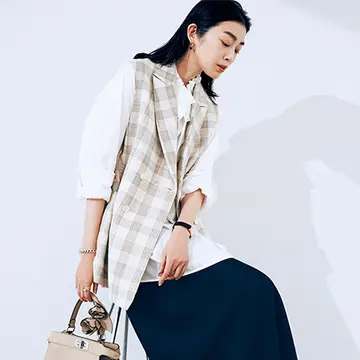 背中やボディラインをおしゃれにカバーできるロングジレは、腕まわりが気になるアラフィー向けに、肩のラインやアームホールのシルエットにこだわったデザインも秀逸。最高気温26℃の日ならジレを着たまま過ごしても暑すぎないし、空調の効いた屋内での冷え対策にもなる。