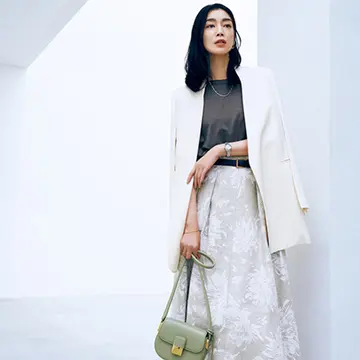 スカート¥198,000・ブラウス¥77,000/ブラミンク ピアス¥156,200・ネックレス¥471,900・ブレスレット¥216,700・Apple Watch Hermès ¥196,800(ケース&レザーベルトのセット価格)・バッグ¥797,500・靴¥107,800/エルメスジャポン(エルメス)