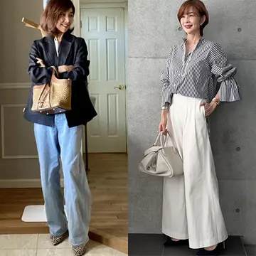 休日のスタイリングで登場率の高いデニムは、フェミニンなアイテムを合わせることで大人の品とこなれ感が手に入る。朝から夜までお出かけするなら、ばさっと羽織るだけで決まるアウターがあると便利。