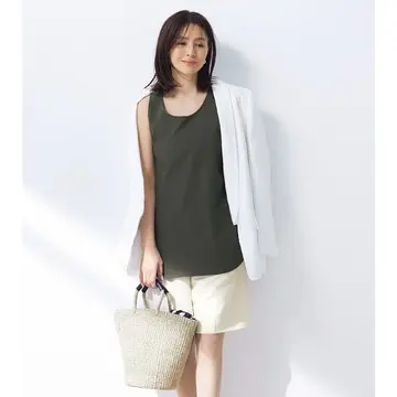 袖スリット半袖トップス¥25,300(商品コード411415)/エクラプレミアム通販(チノ×エクラ) バッグ¥61,600(商品コード402450)/エクラ プレミアム通販(アエタ) パンツ¥42,900/エイトン青山(エイトン) ピアス¥35,200・バングル¥63,800/マリハ