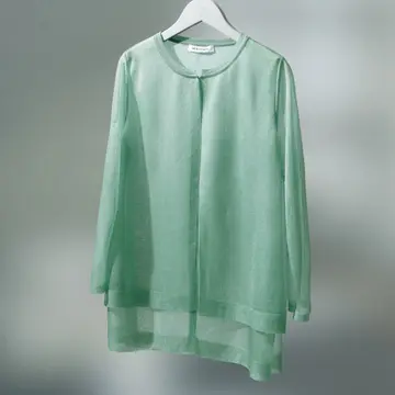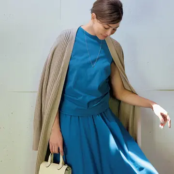 ロングカーディガンとウエストにドロストがついたワイドパンツのリラックス感ある組み合わせも、夏の自然の雄大さを想起させるような鮮やかなグリーンの魅力でエレガントさがアップ!